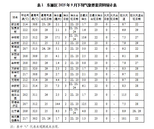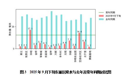 本旬我区各街道平均气温20.2~22.2℃,较去年同期(19.0~20.7℃)变幅1.1~1.8℃,最高气温32.3℃,出现在9月25日的北于堡;降水量1.4~17.1毫米,较去年同期(23.8~34.1毫米)变幅-32.7~-10.7毫米,降水2~3天;旬日照时数63.2小时,较去年同期(71.4小时)偏少8.2小时;无7级以上大风。