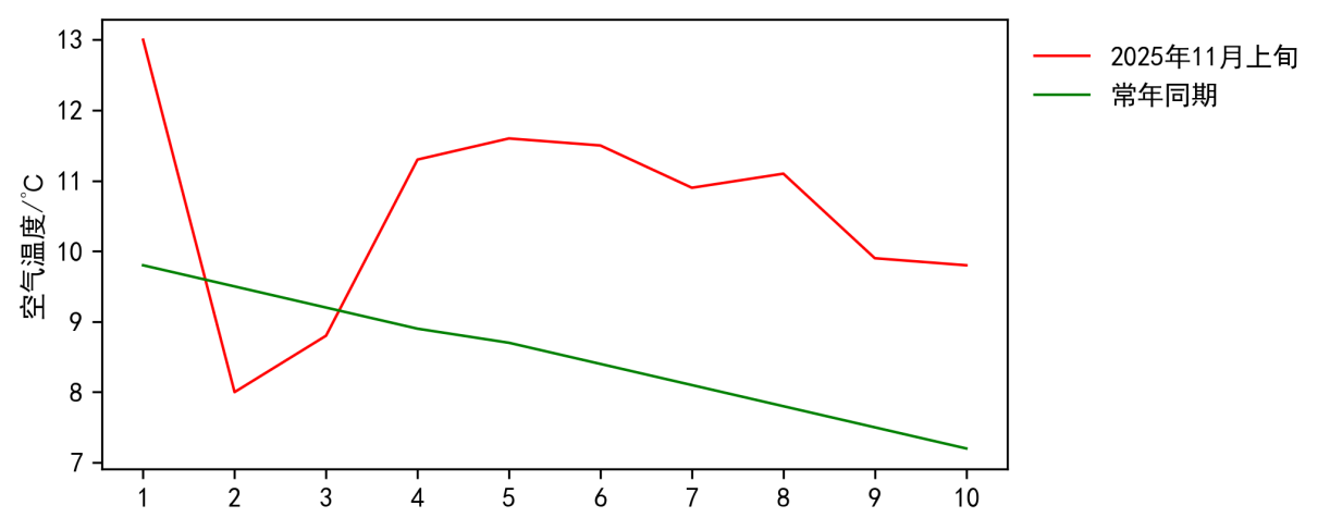 图2 2025年11月上旬东丽区日平均气温与常年同期对比图