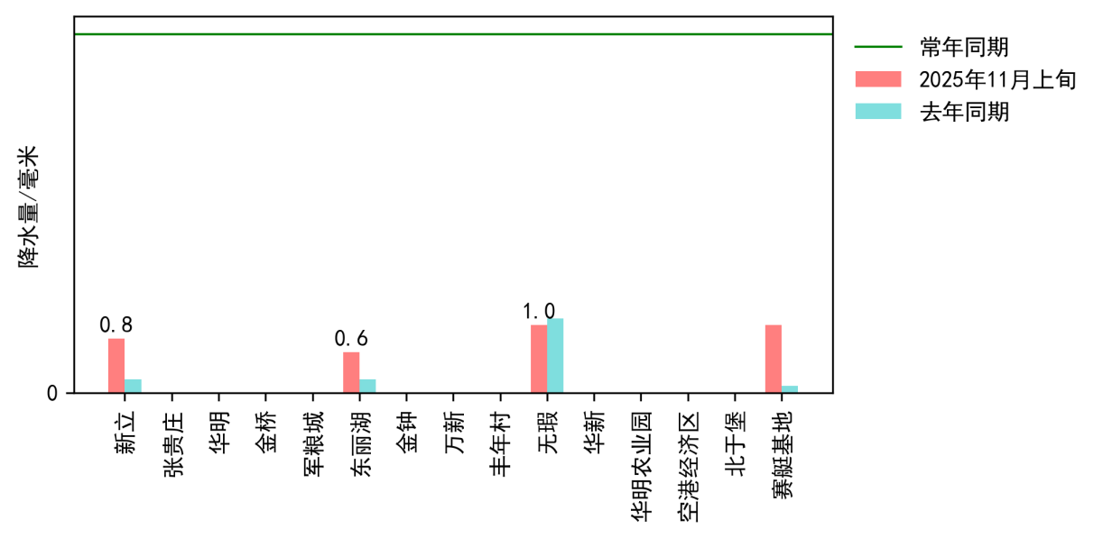 图3 2025年11月上旬东丽区降水与去年及常年同期对比图