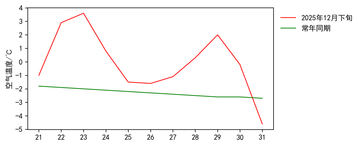 图2 2025年12月下旬东丽区日平均气温与常年同期对比图