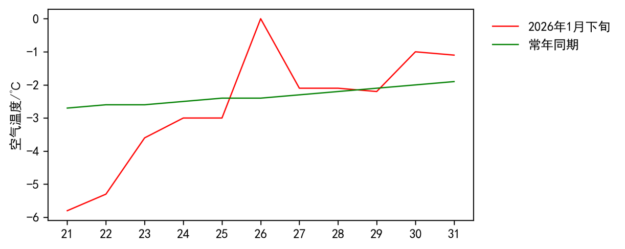 图2 2026年1月下旬东丽区日平均气温与常年同期对比图
