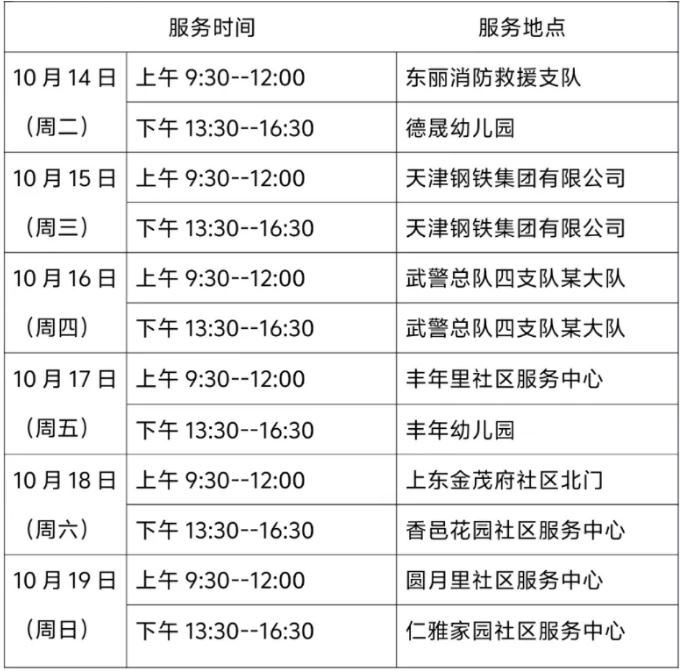 东丽区图书馆流动服务车服务时间地点(10月14日—10月19日)