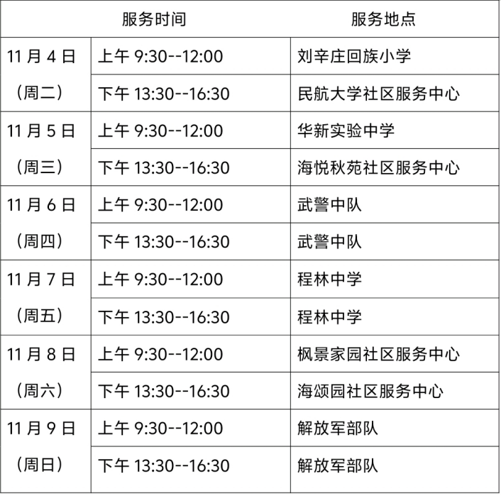 东丽区图书馆流动服务车服务时间地点(11月4日—11月9日)