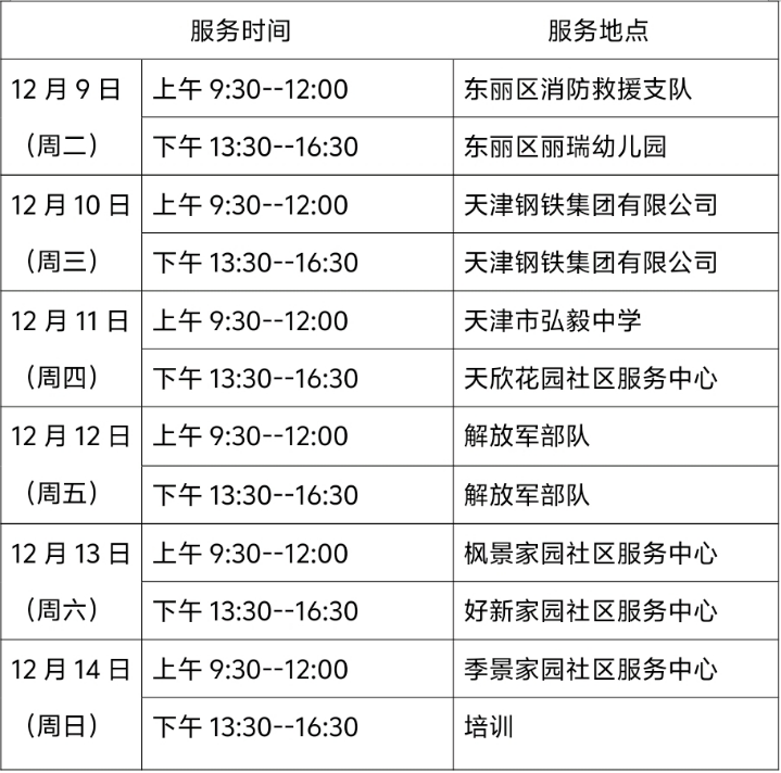 东丽区图书馆流动服务车服务时间地点(12月9日—12月14日)