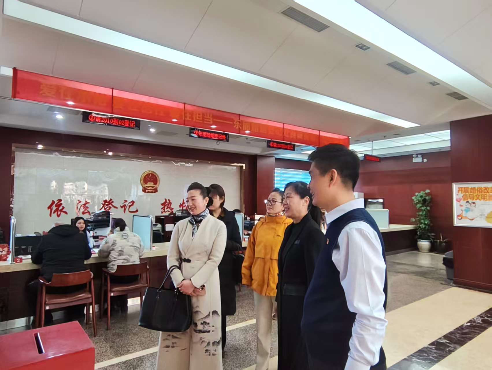 活动伊始,代表们实地参观了婚姻登记大厅。工作人员详细介绍了婚姻登记咨询台、颁证区等功能区域,解读了婚姻登记“全国通办”政策及登记流程,同时介绍了婚俗文化宣传等内容。代表们不时驻足询问、拍照,对大厅温馨的服务环境、高效的办理流程和人性化的服务细节给予充分肯定。