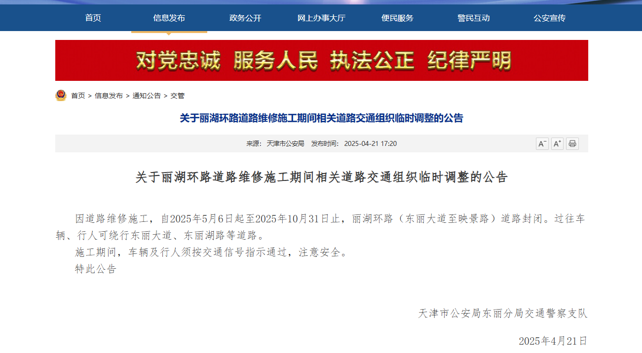 天津市公安局官网近日发布通告,因道路整体维修需要,东丽湖区域丽湖环路(东丽大道至映景路)将于2025年5月6日至10月31日进行为期6个月的全封闭施工。