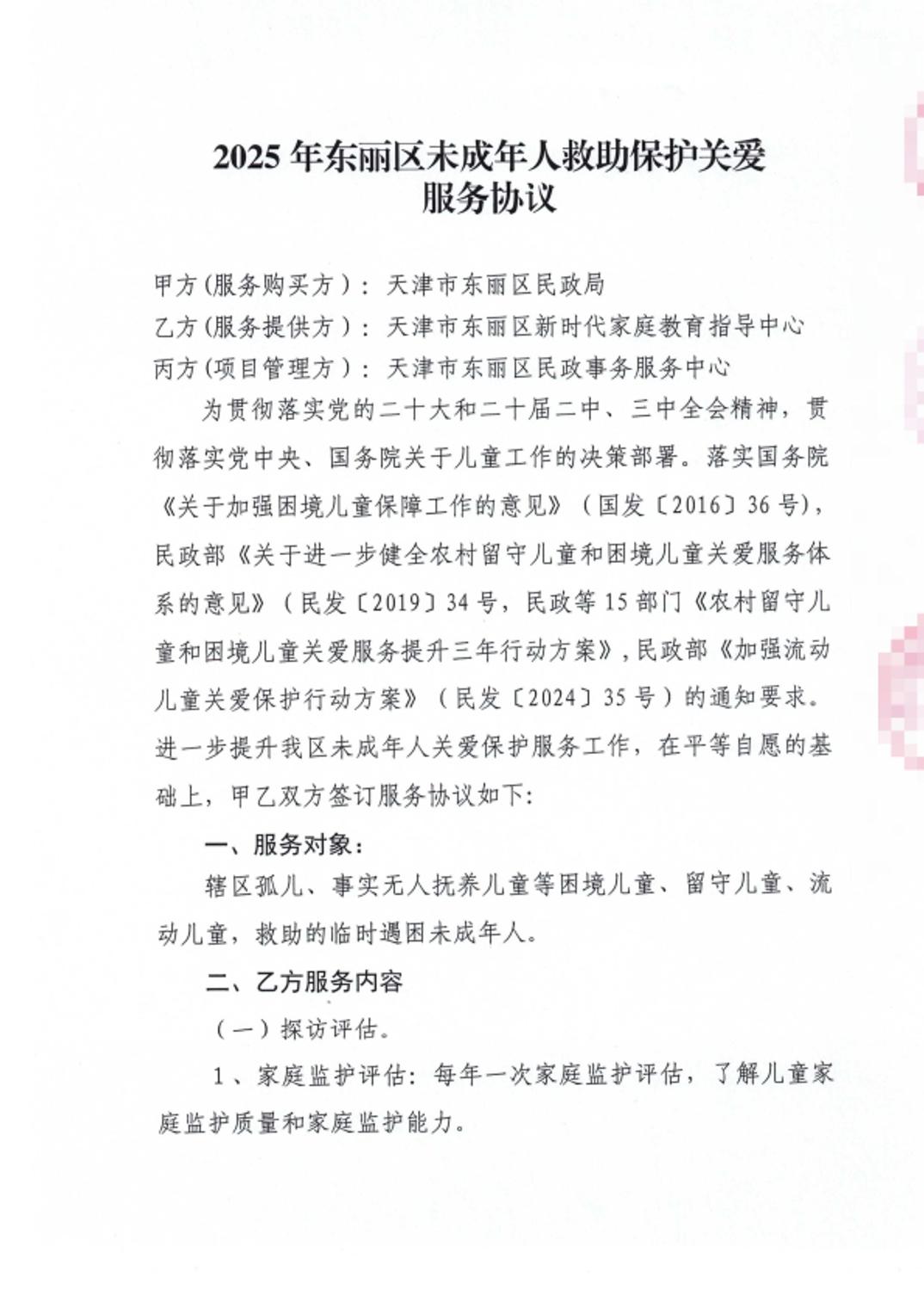 2025年东丽区未成年人救助保护关爱服务协议