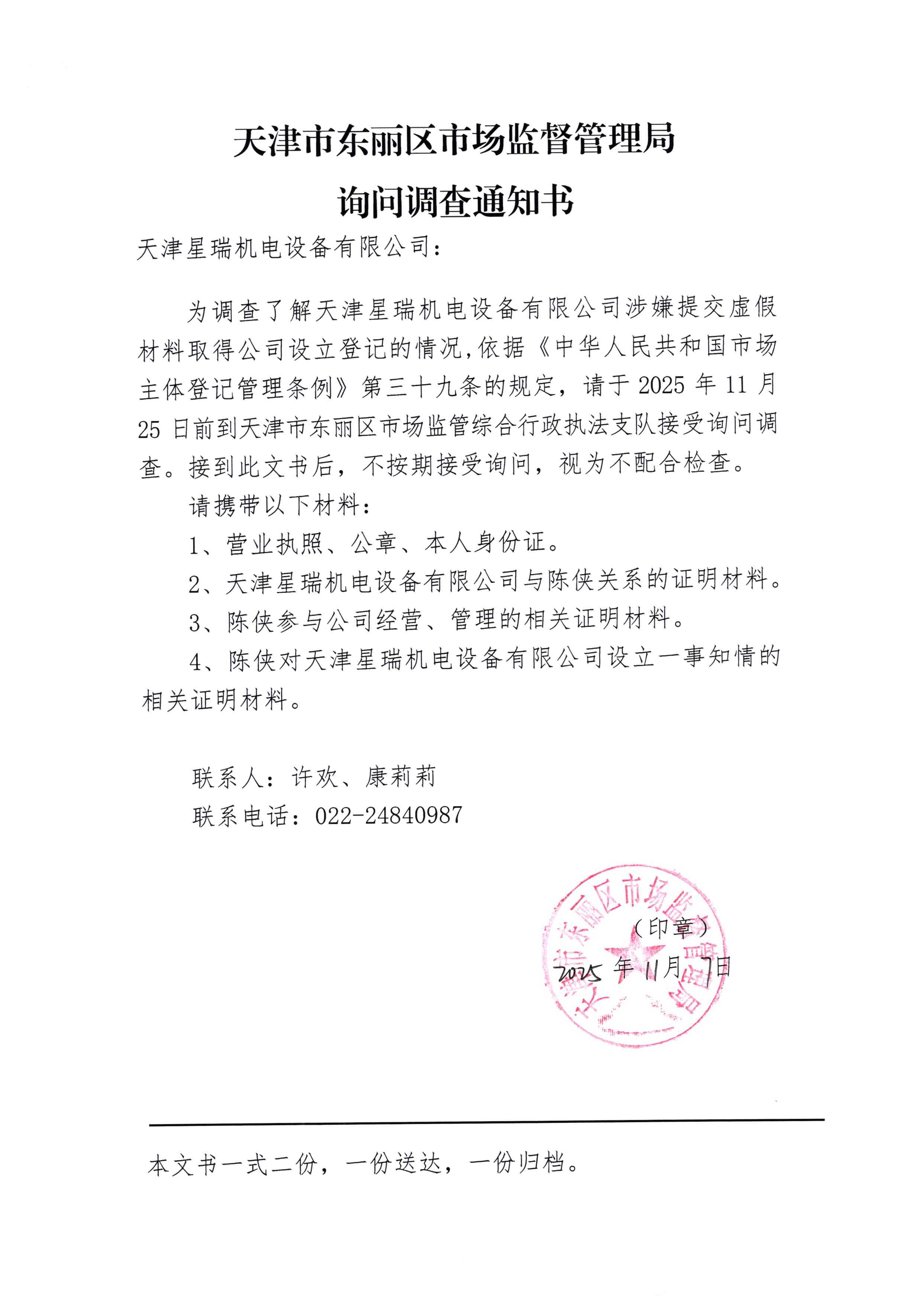 询问调查通知书-天津星瑞机电设备有限公司