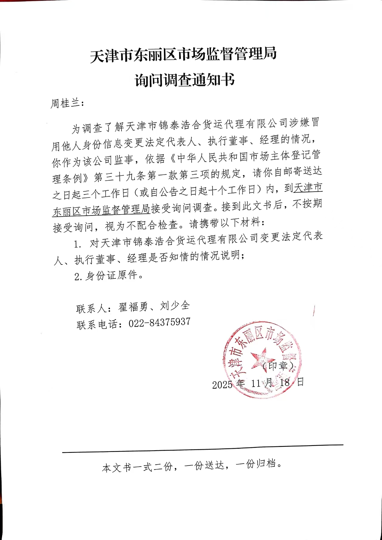询问调查通知书——周桂兰(天津市锦泰浩合货运代理有限公司)