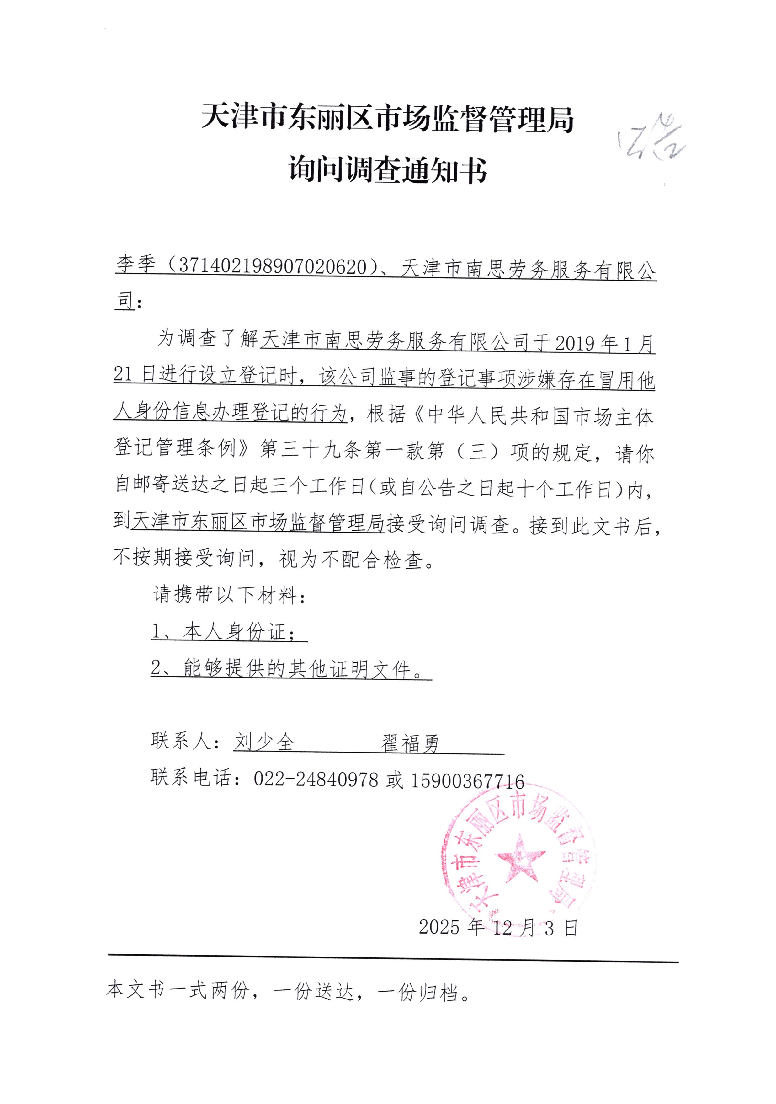 询问调查通知书——李季(天津市南思劳务服务有限公司)