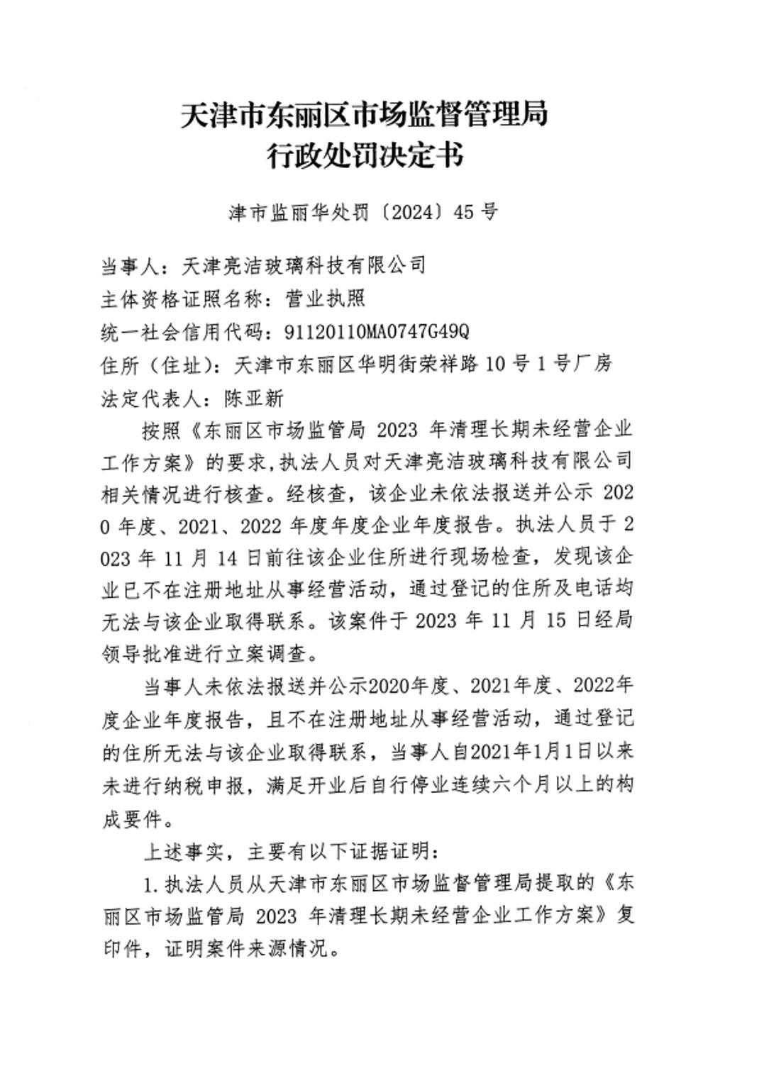 行政处罚决定书--天津亮洁玻璃科技有限公司