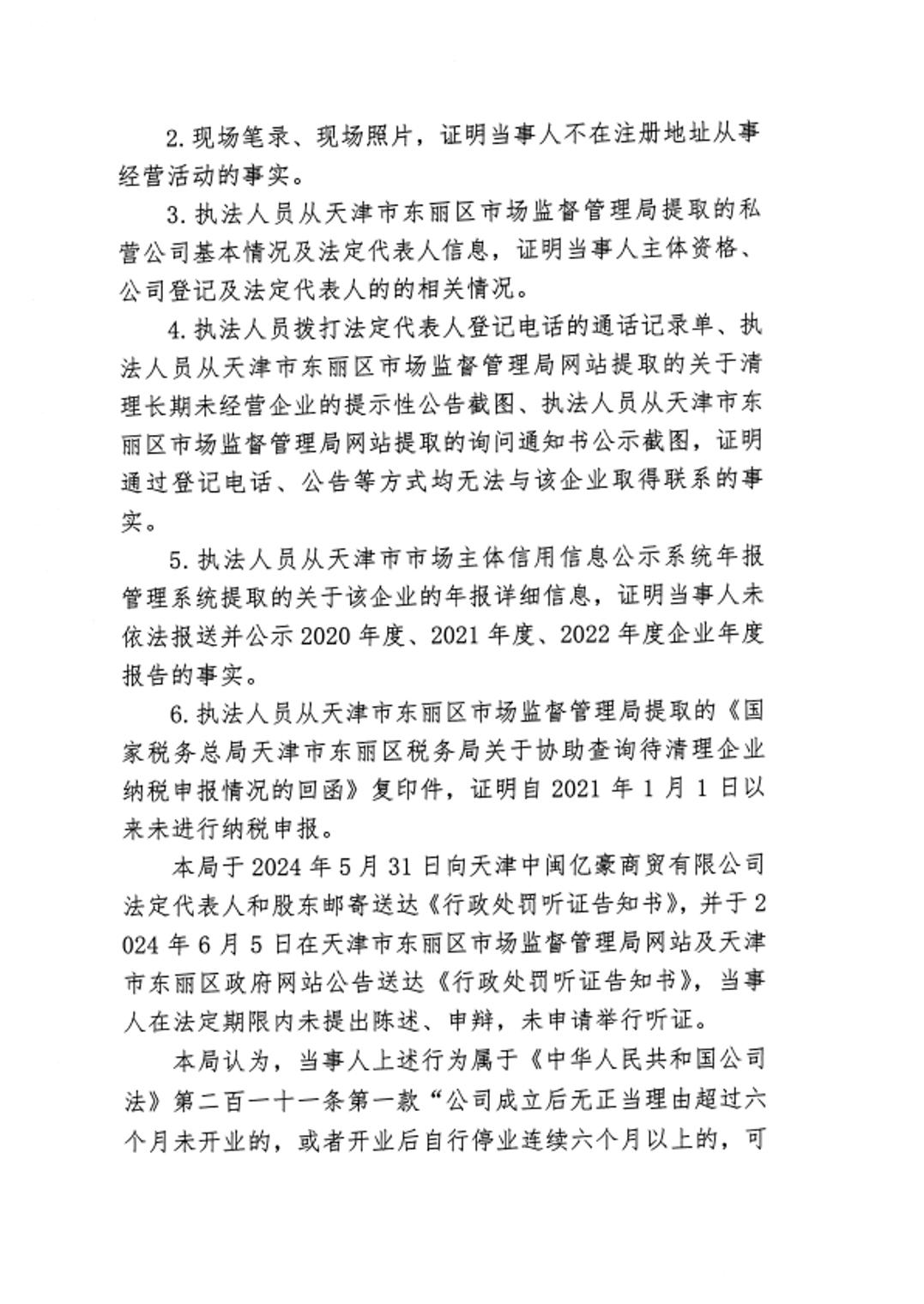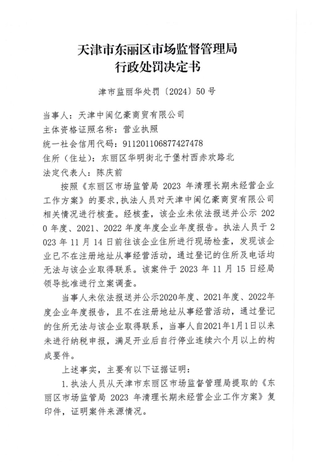 行政处罚决定书--天津中闽亿豪商贸有限公司