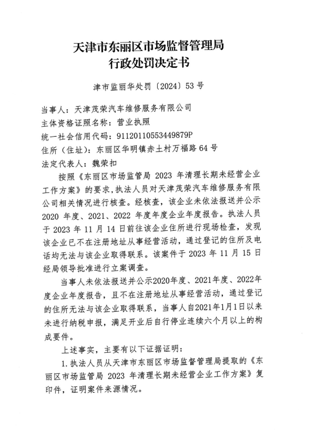 行政处罚决定书--天津茂荣汽车维修服务有限公司