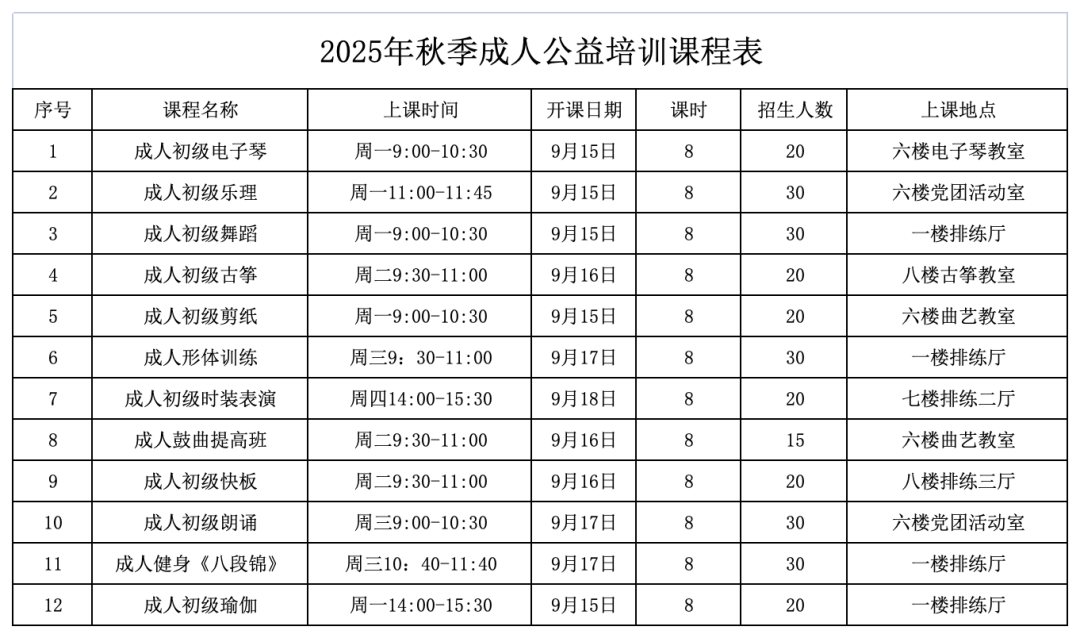 四、2025年东丽区文化馆春季成人公益培训课程表:
