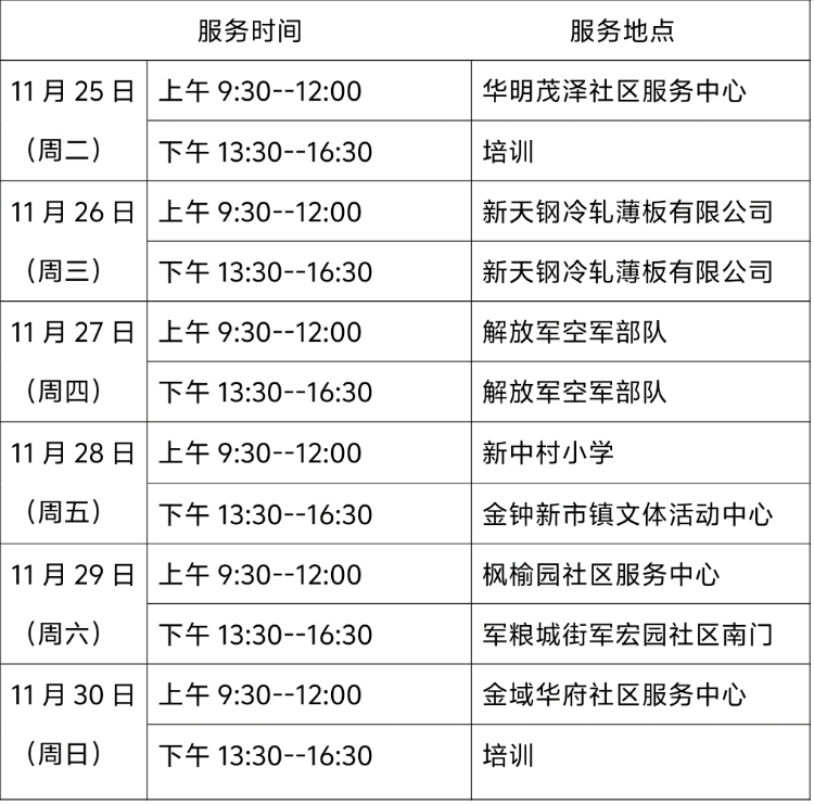 东丽区图书馆流动服务车服务时间地点(11月25日—11月30日)