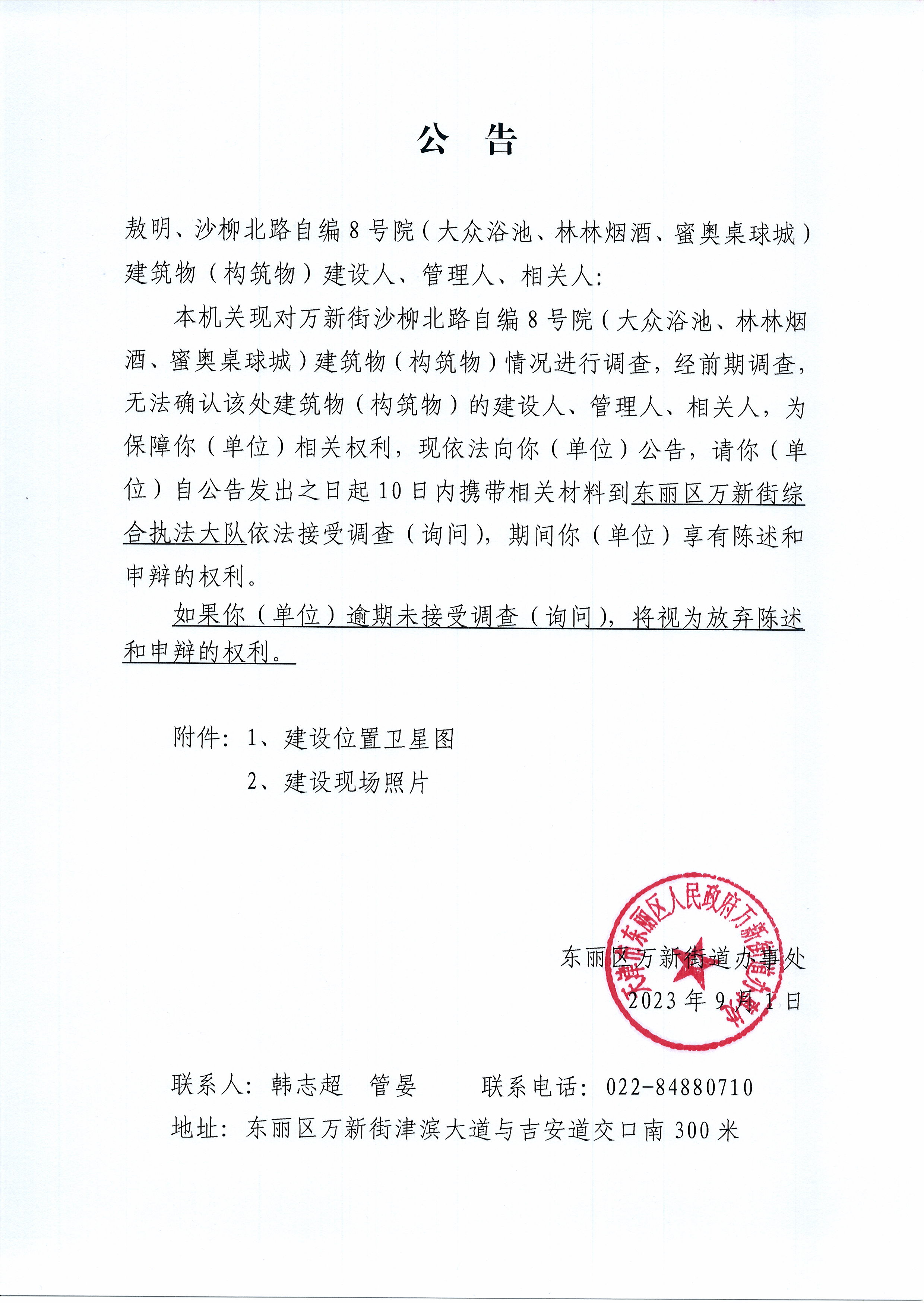 本机关现对万新街沙柳北路自编8号院(大众浴池、林林烟酒、蜜奥桌球城)建筑物(构筑物)情况进行调查,经前期调查,无法确认该处建筑物(构筑物)的建设人、管理人、相关人,为保障你(单位)相关权利,现依法向你(单位)公告,请你(单位)自公告发出之日起10日内携带相关材料到东丽区万新街综合执法大队依法接受调查(询问),期间你(单位)享有陈述和申辩的权利。