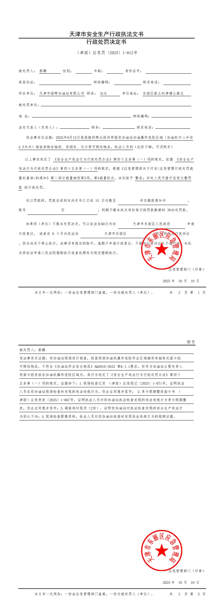 东丽区应急管理局行政处罚决定书【2025】1-012号