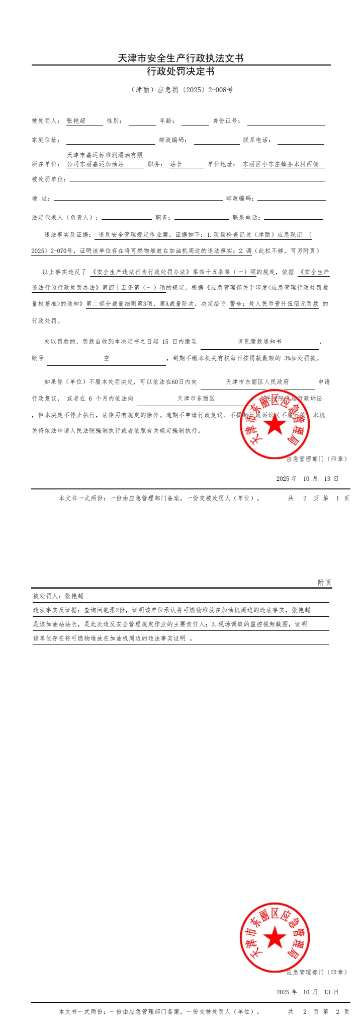东丽区应急管理局行政处罚决定书【2025】2-008号
