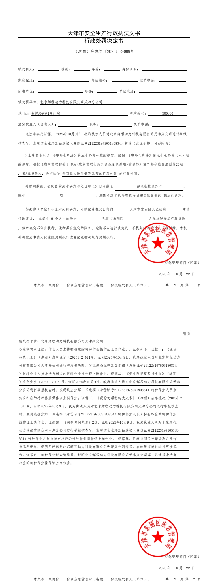 东丽区应急管理局行政处罚决定书【2025】2-009号