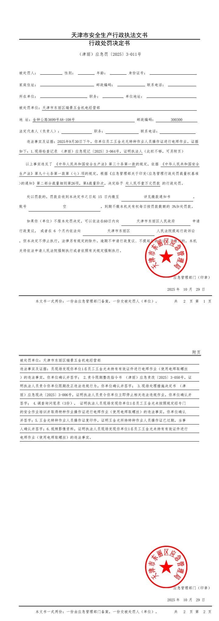 东丽区应急管理局行政处罚决定书【2025】3-011号