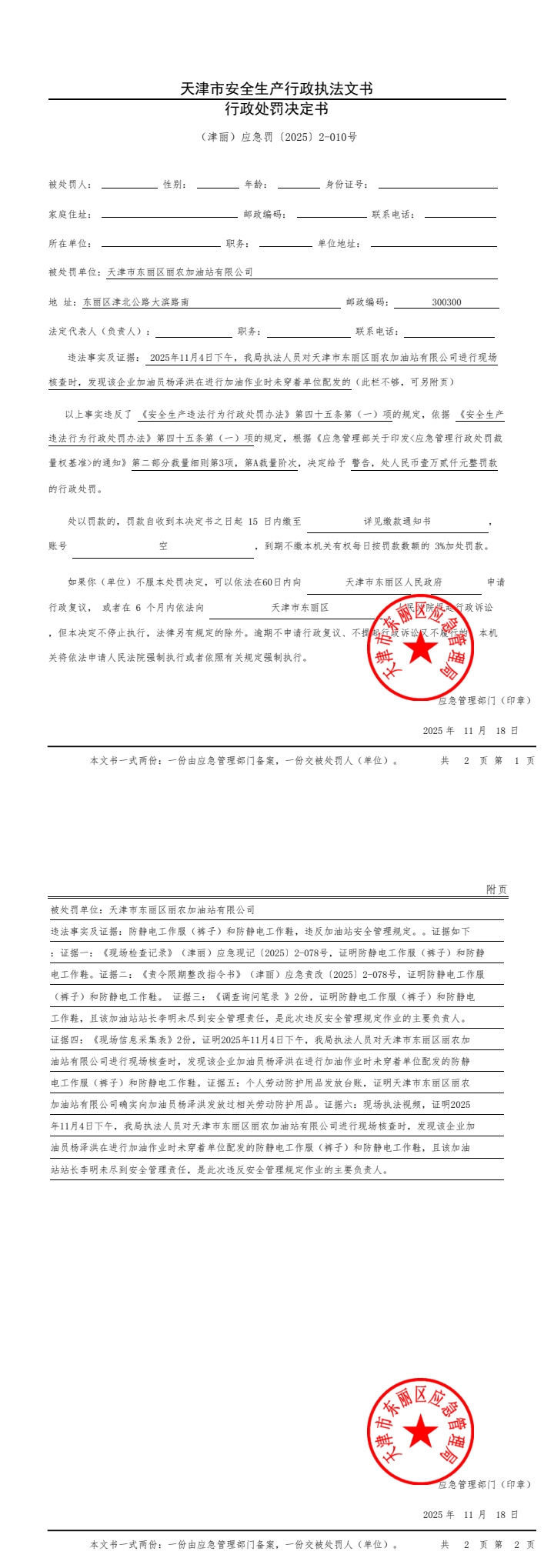 东丽区应急管理局行政处罚决定书【2025】2-010号
