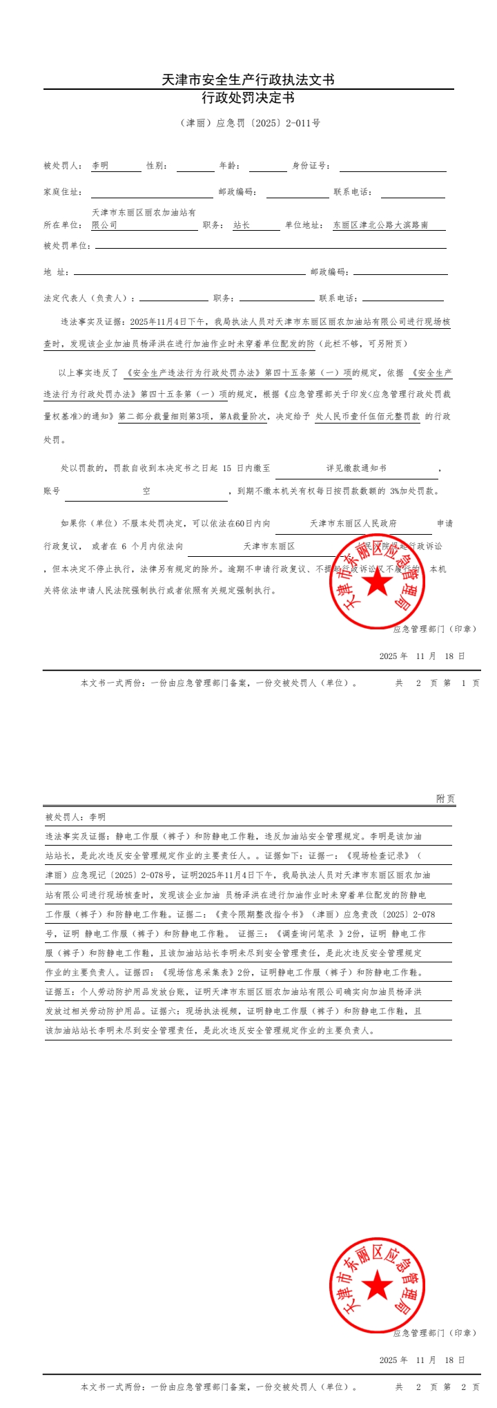 东丽区应急管理局行政处罚决定书【2025】2-011号