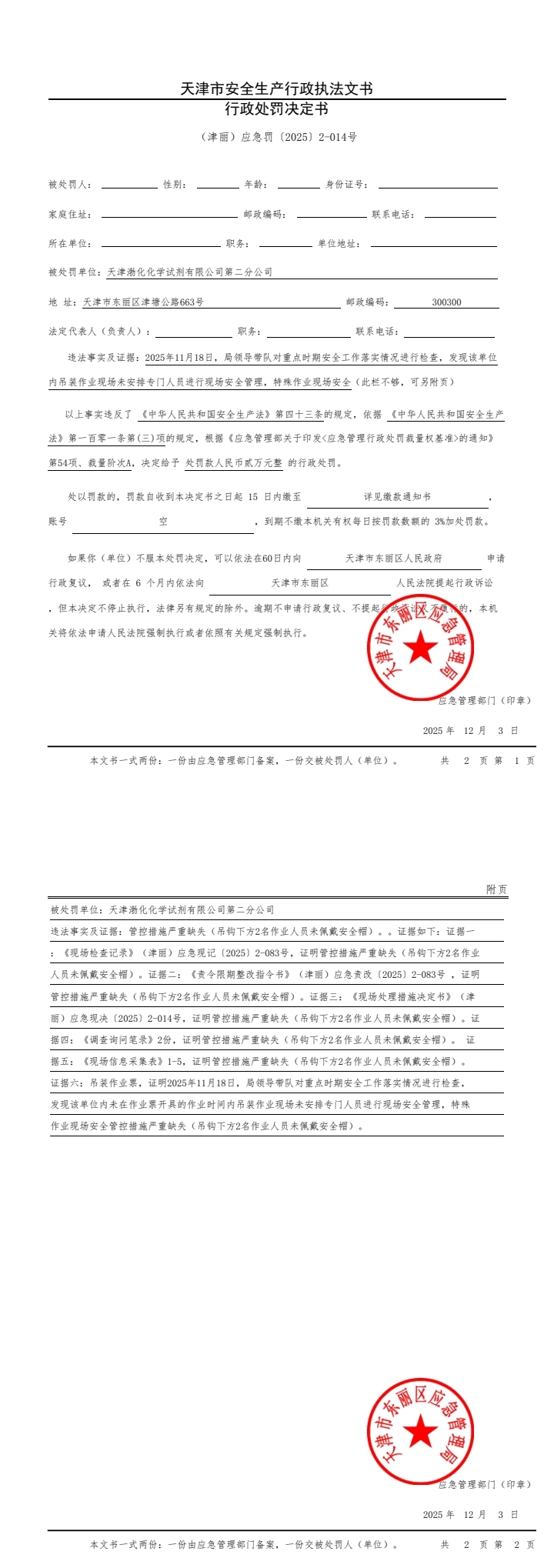 东丽区应急管理局行政处罚决定书【2025】2-014号