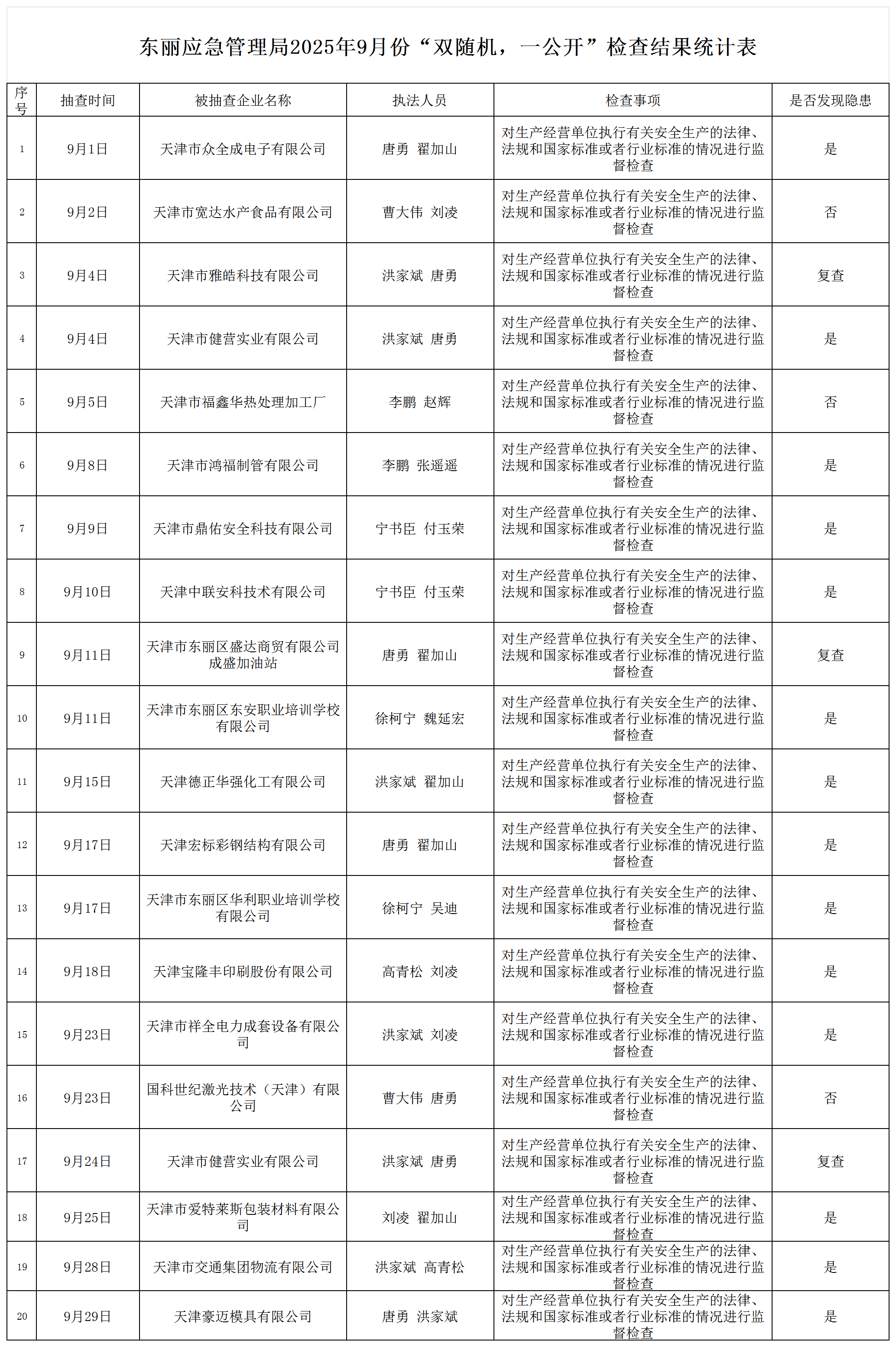 东丽区应急管理局2025年9月份“双随机、一公开”检查结果统计表