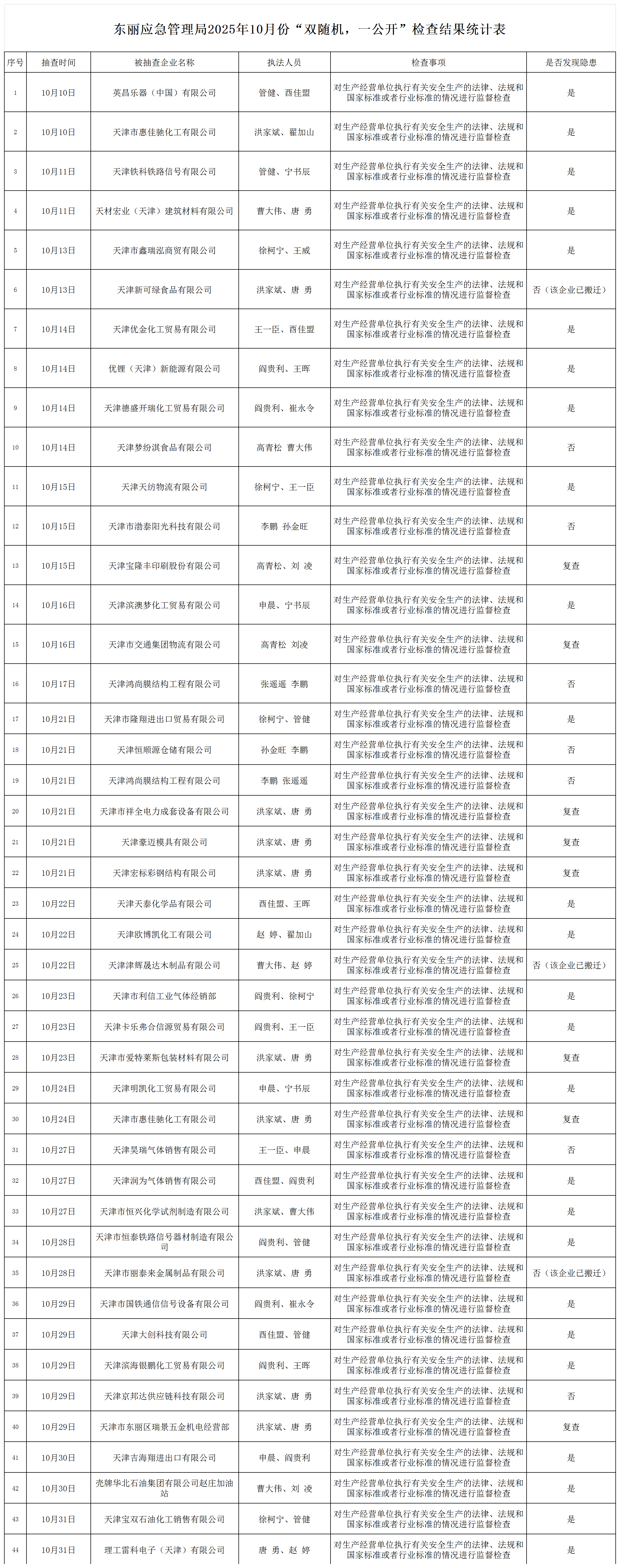 东丽区应急管理局2025年10月份“双随机、一公开”检查结果统计表