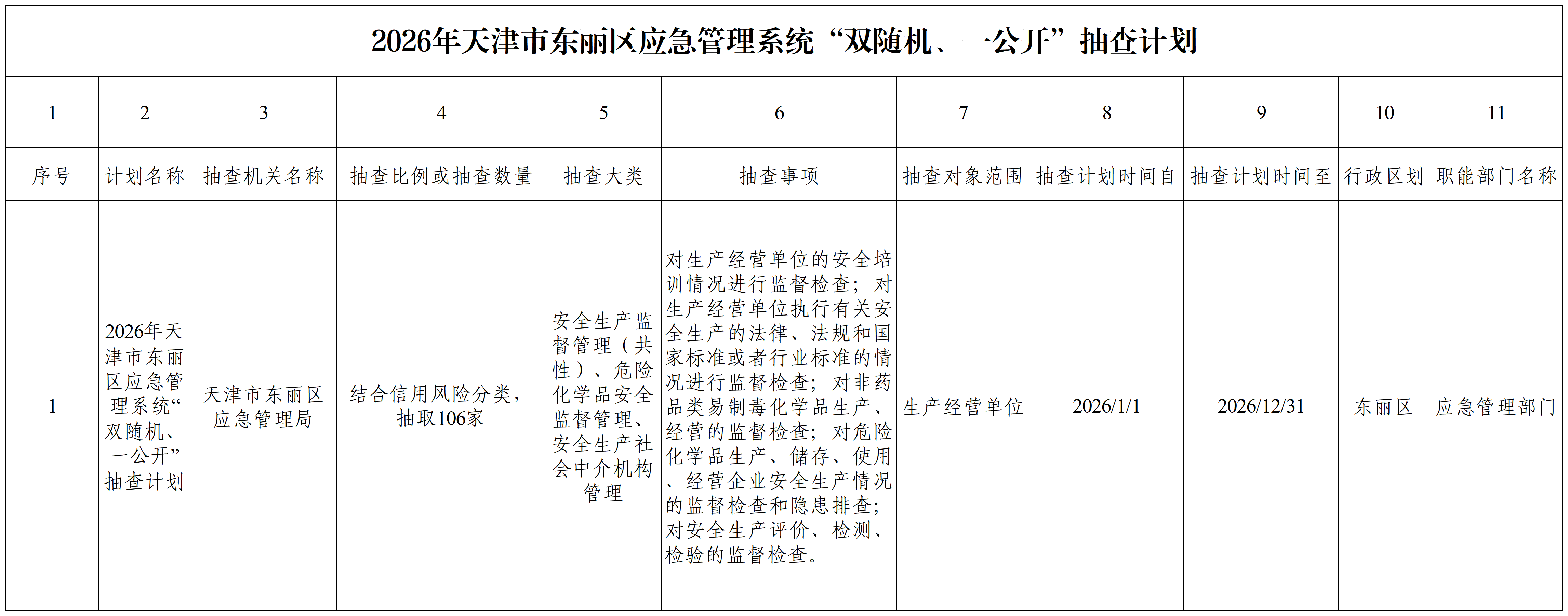 2026年天津市东丽区应急管理系统“双随机、一公开”抽查计划