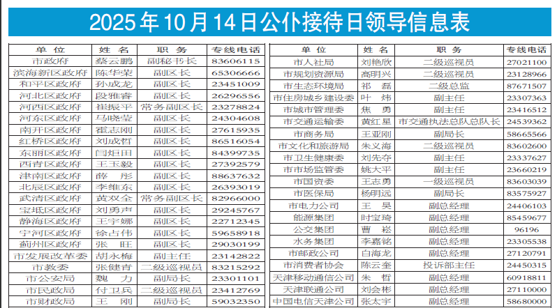 本报讯(记者 高立红)10月14日是全市“公仆接待日”活动时间,当天9:00—11:30,全市43个单位的相关负责同志将在各自单位接听热线电话,为群众解答相关政策,听取大家意见建议。鉴于活动期间拨打热线电话的市民较多,如遇到占线请您不要着急,您还可以选择随时拨打“天津12345政务服务便民热线”进行咨询、求助、投诉、举报和提出意见建议。已进入诉讼、行政复议、信访复查复核等法定程序的事项不在“公仆接待日”活动的受理范围,请您支持理解,并把宝贵的时间留给更多市民朋友。